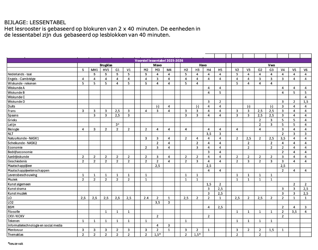 Het lesrooster is gebaseerd op blokuren van 2 x 40 minuten. De eenheden in de lessentabel zijn dus gebaseerd op lesblokken van 40 minuten.